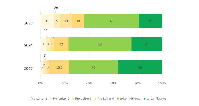 Desde 2023, este é o menor índice de alunos nos primeiros três níveis de pré-leitores: uma soma de 7% em 2025, 11% em 2024 e 26% em 2023. Isso significa que os alunos estão avançando, ao longo dos anos, rumo aos leitores iniciantes e fluentes.